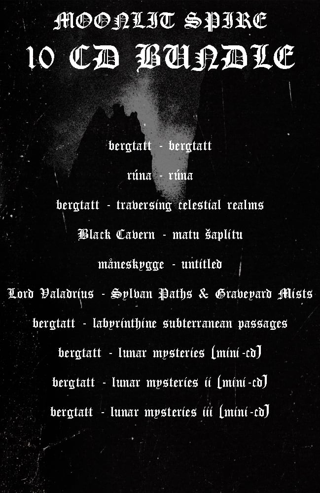 All black CDr. “bergtatt”, “rúna”, “traversing celestial realms”, and “matu šaplitu” come in a clear lp-style sleeve with full artwork (similar to a 7”). “untitled”, “Sylvan Paths & Graveyard Mists” & “labyrinthine subterranean passages” are housed in a slim dvd case. “lunar mysteries i – iii” are mini-discs.
